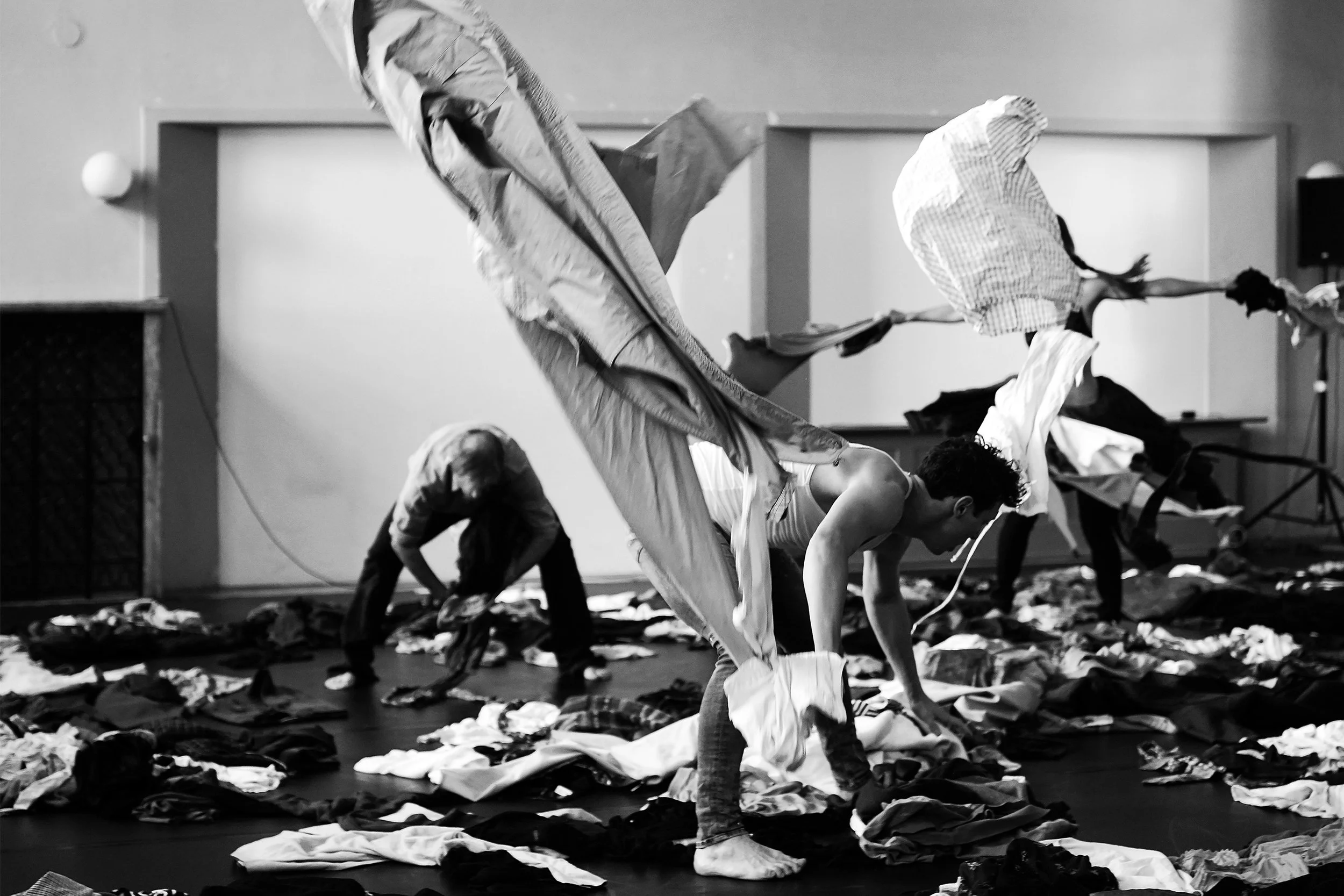 Die Fotografin und Künstlerin Daniela Wolf studierte Bildhauerei an der Akademie der Bildenden Künste Stuttgart. Seit vielen Jahren begleitet sie fotografisch die freie Tanz- und Theaterszene. Mit der Tänzerin und Choreografin Juliette Villemin entwickelte sich eine enge künstlerische Zusammenarbeit, die ihr Verständnis für zeitgenössischen Tanz nachhaltig prägte. Die Fotografien zum Tanztheater Die Begehrenden von Juliette Villemin zeigen einen Tänzer, eine Tänzerin und einen Schauspieler inmitten von Kleiderbergen, in denen sich Ordnung auflöst und immer wieder neu formiert. Kleidung wird zu einem offenen Material- und Spielraum, in dem Identitäten und Beziehungen entstehen, sich verändern und wieder verschwinden. Wolfs Fotografien verdichten diese flüchtigen Bewegungen zu Momenten, in denen Unordnung als produktiver Zustand sichtbar wird. Freeze bezeichnet den Moment, in dem Bewegung zur Form wird – einen Schnittpunkt von Tanz, Fotografie und Skulptur. Vor dem Hintergrund des unerwarteten Todes von Juliette Villemin erhält der Begriff zugleich eine melancholische und erinnernde Dimension.